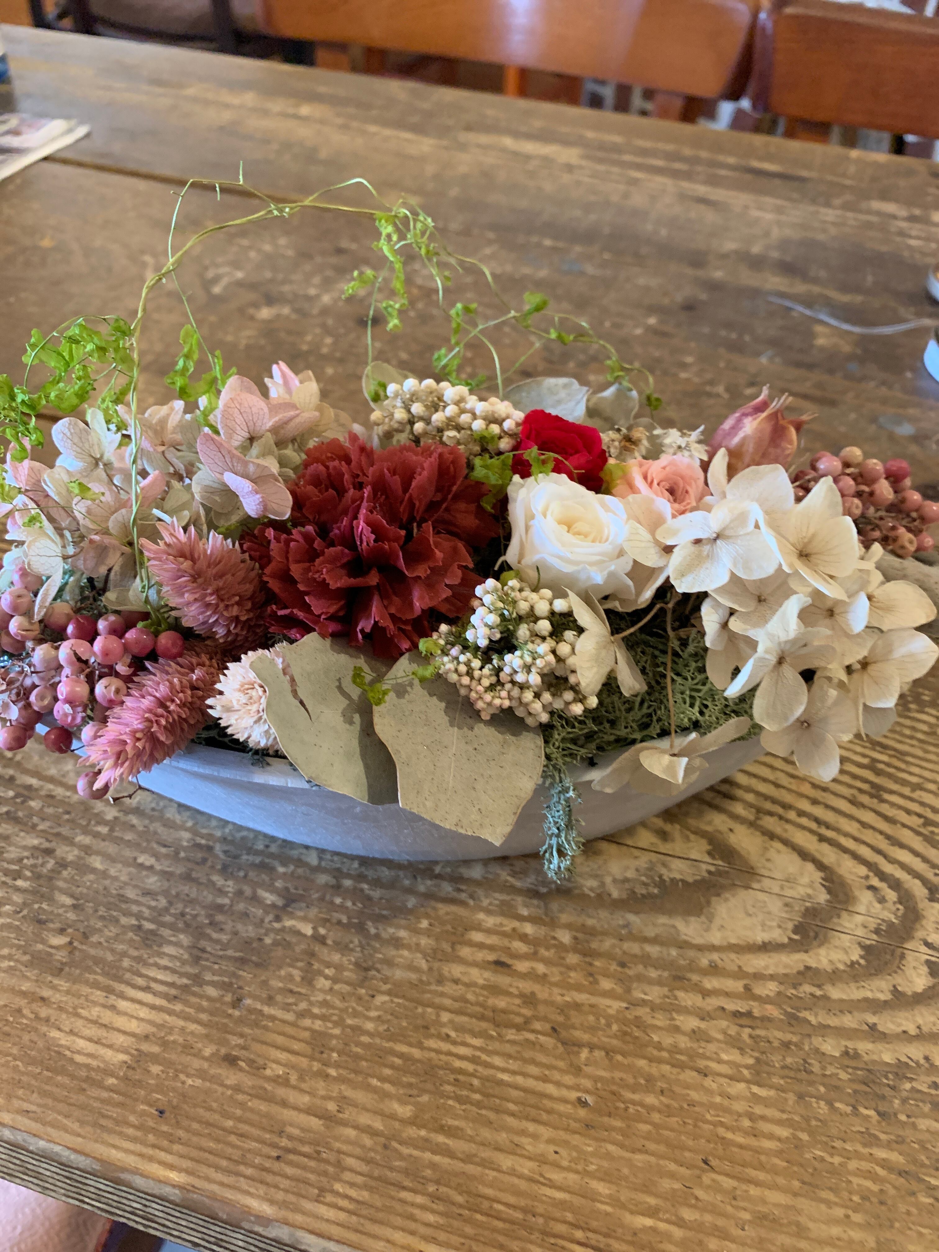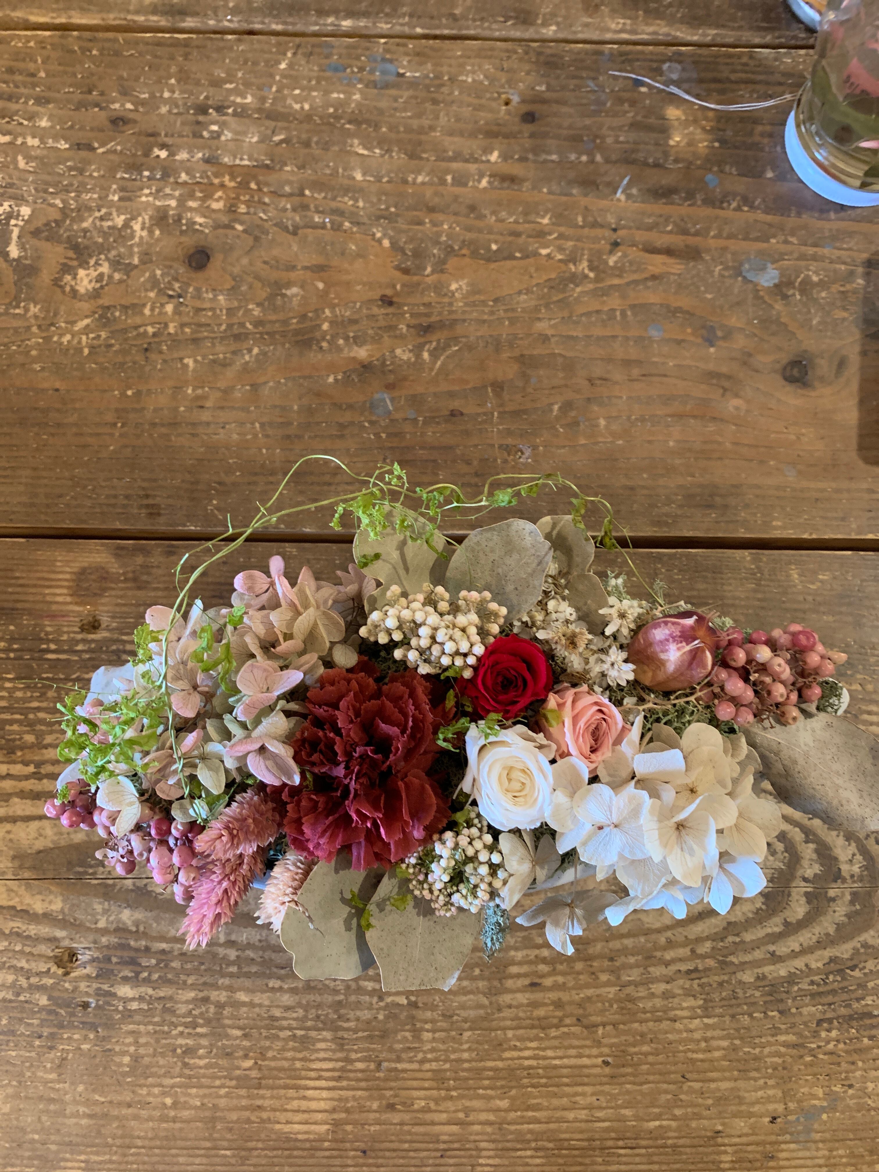 カーネーション、バラ、紫陽花、ライスフラワー、ポアプランツ、ペッパーベリー、ニゲラ