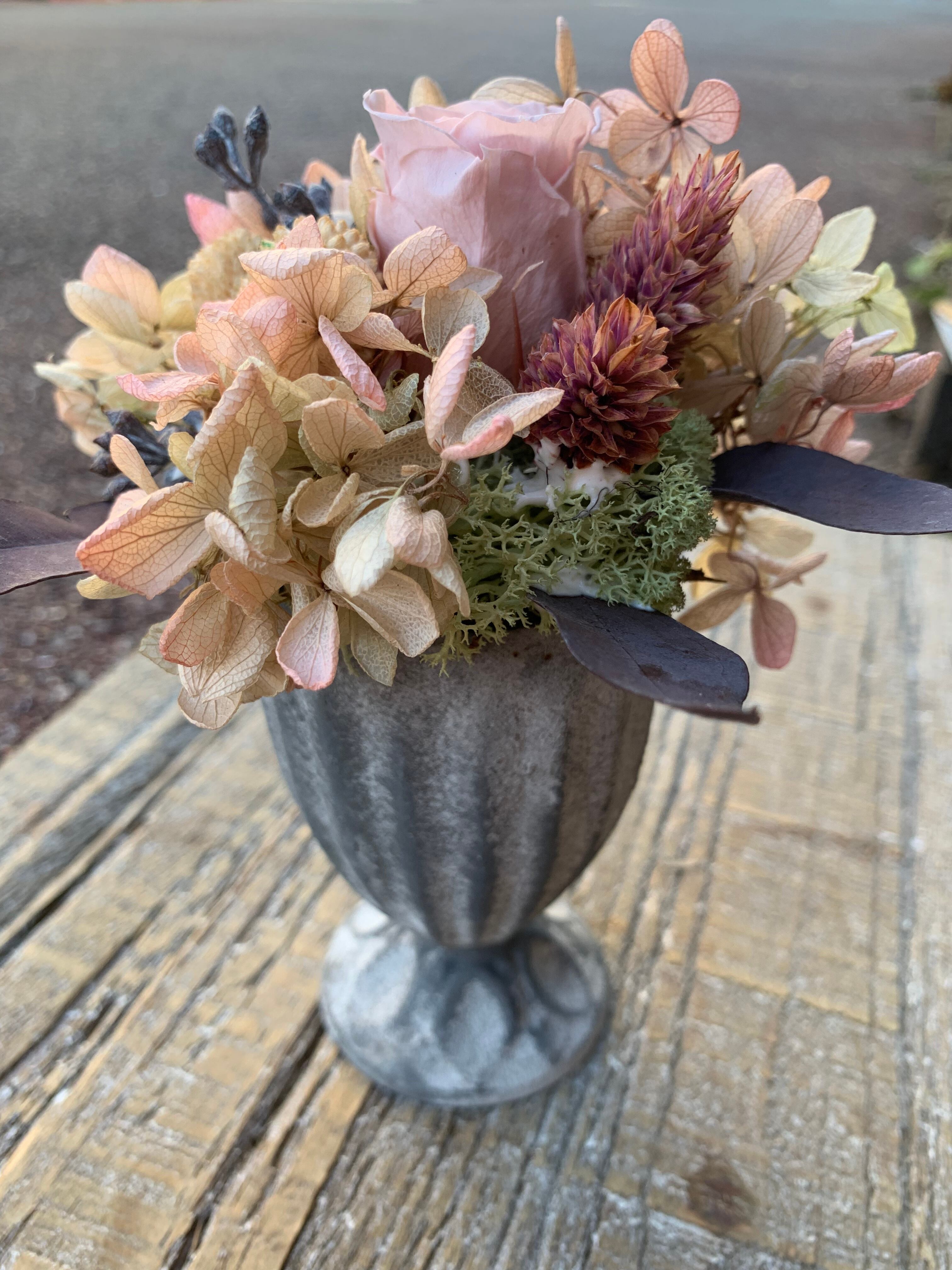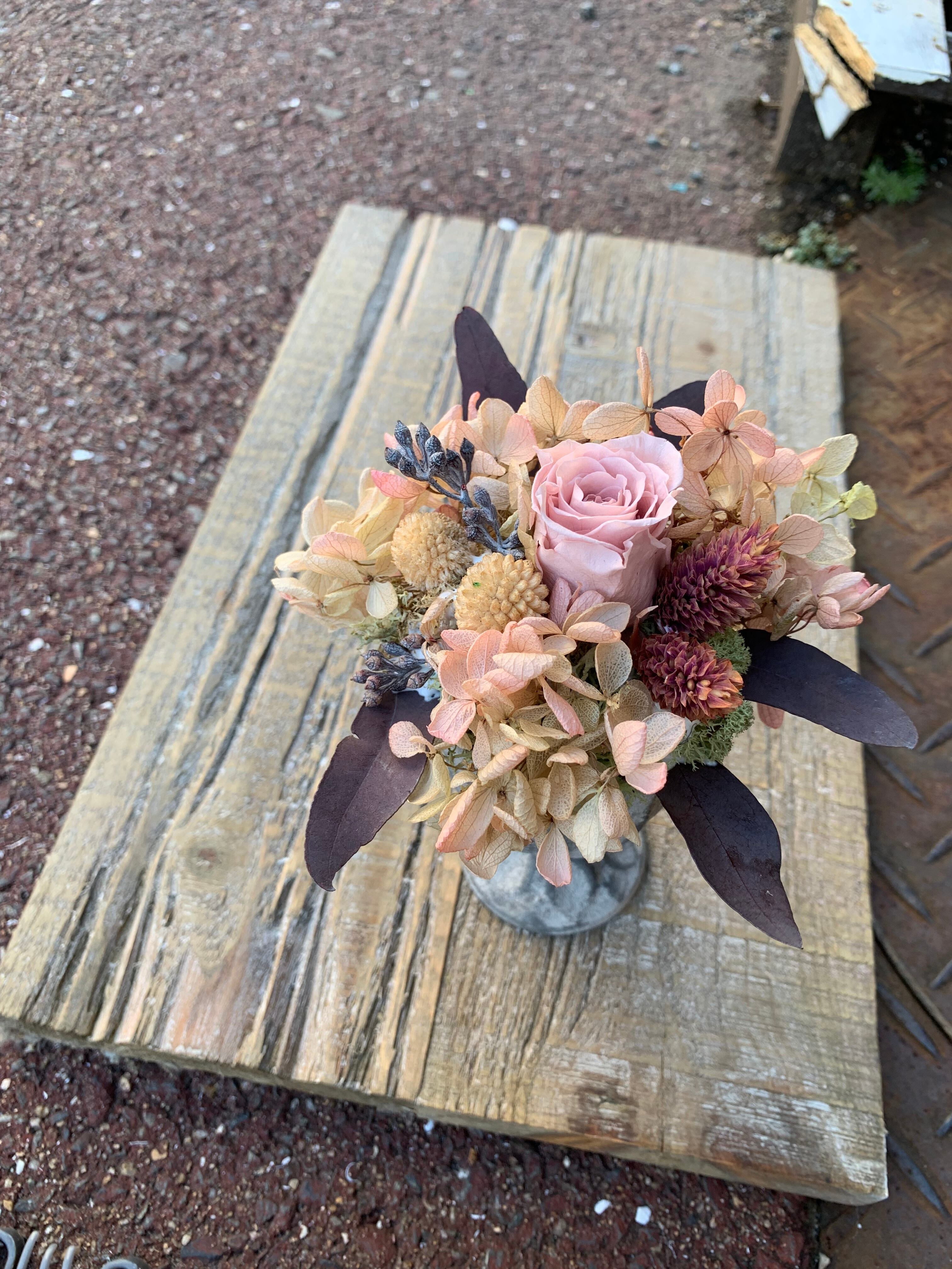 アンティークカラーのプリザーブドフラワーアレンジ。