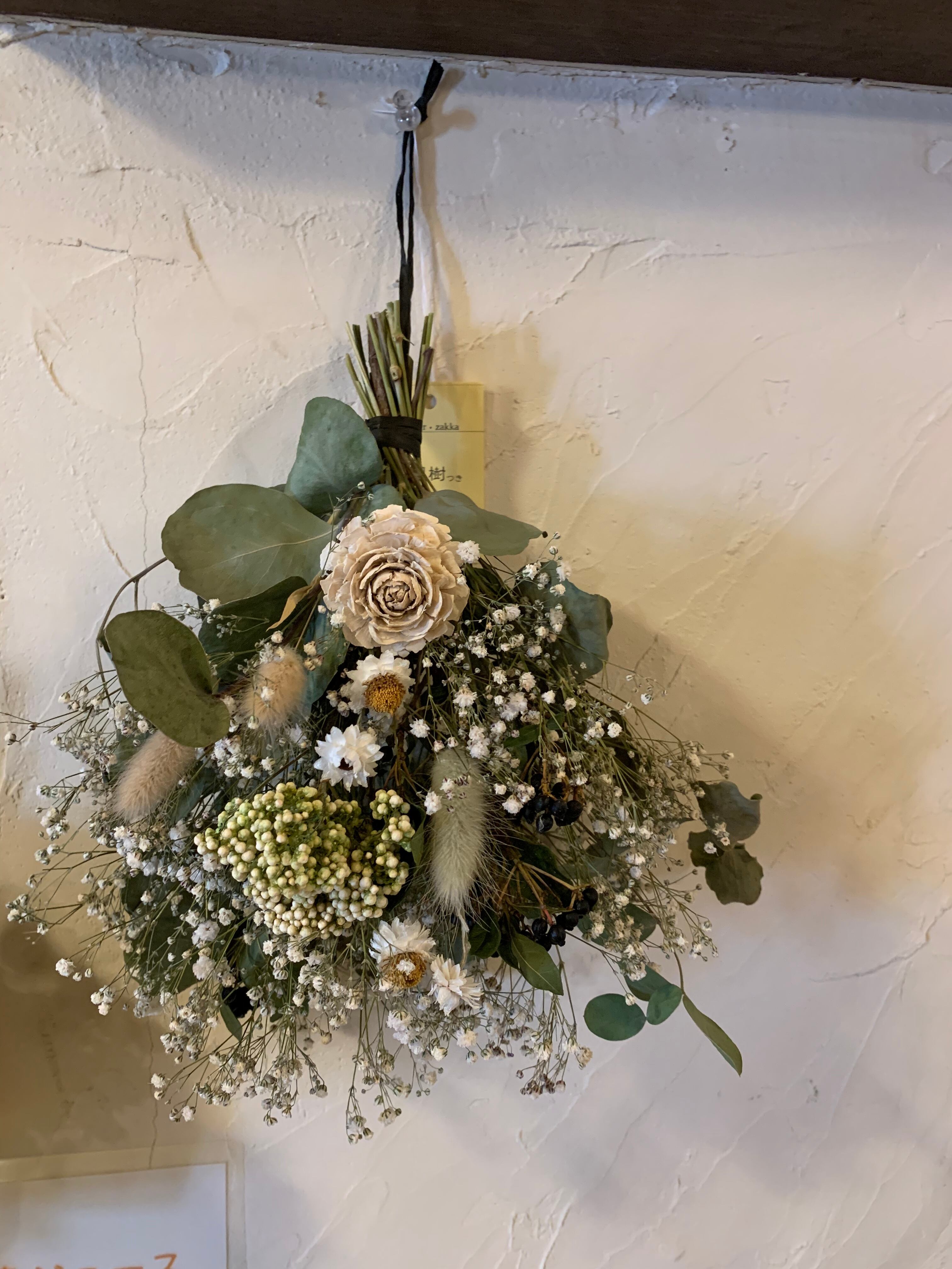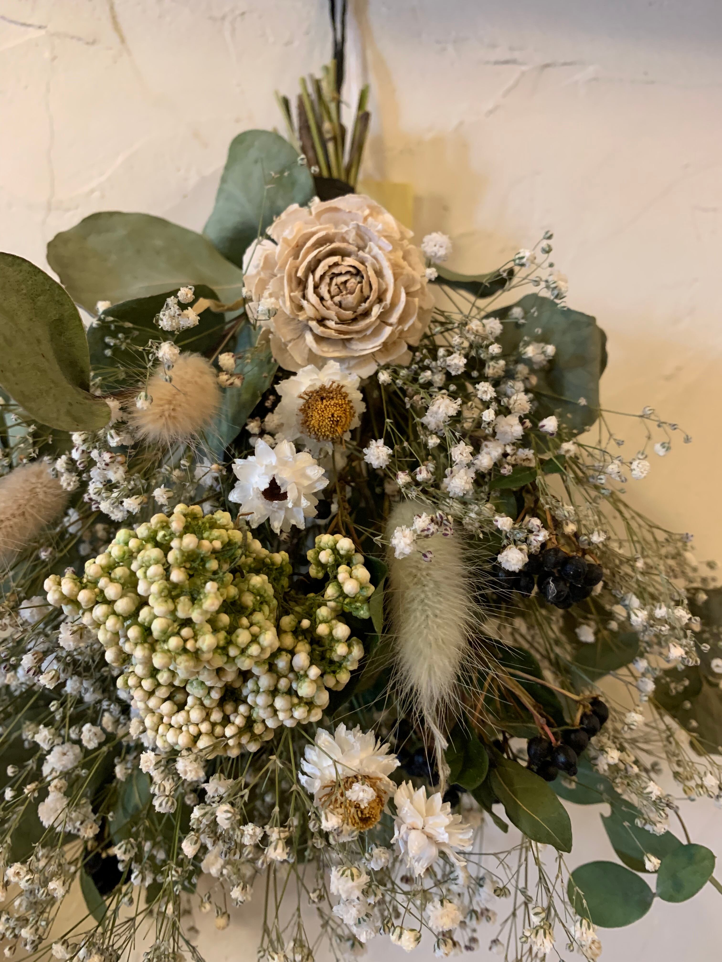 かすみ草、ユーカリ、シダーローズ、ライスフラワー、アンモビューム、ラグラス、アイビーティナス