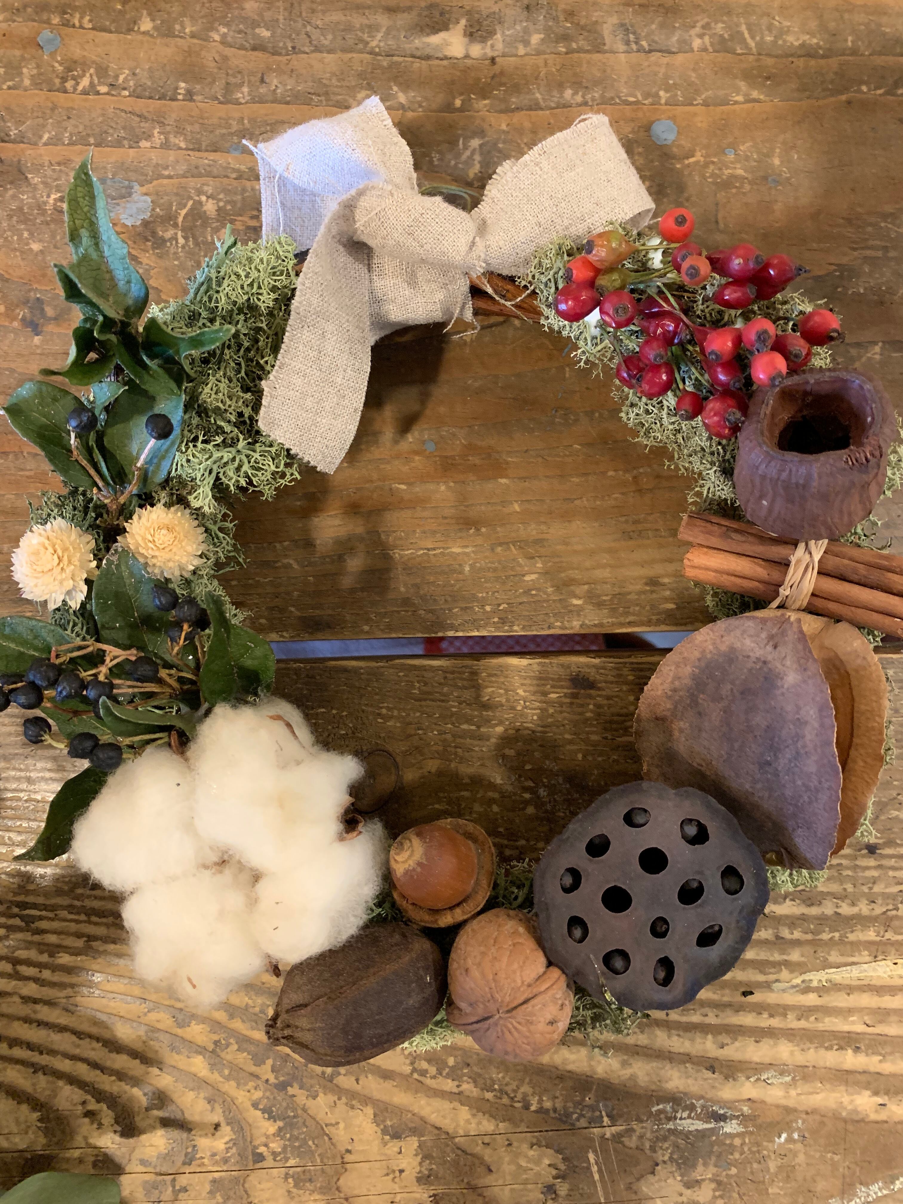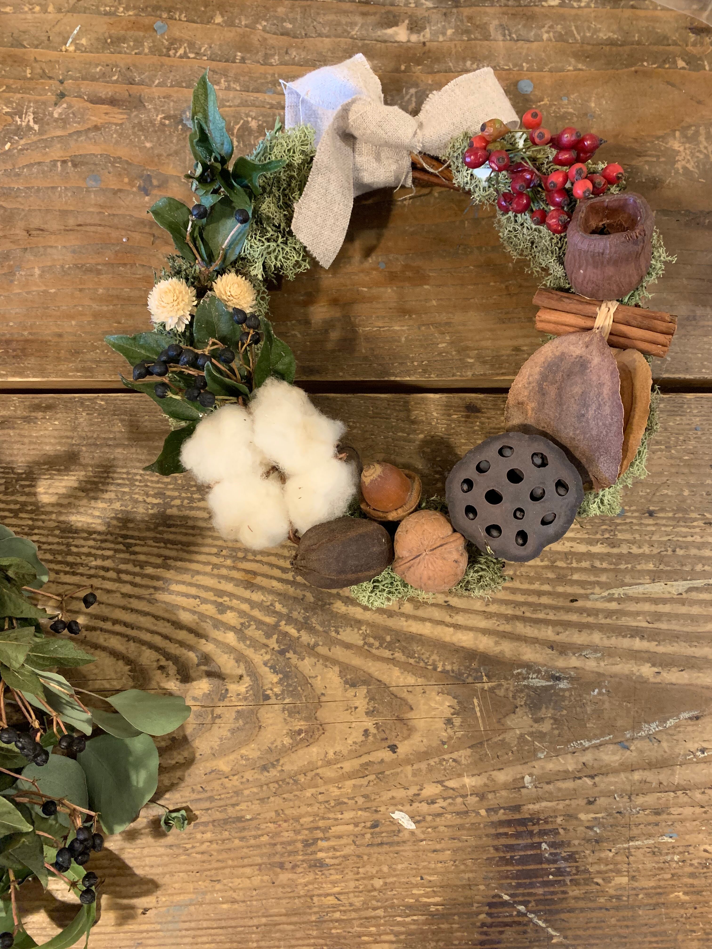 綿、蓮の実、クルミ、ドングリ、アイビーティナス、野いばらの実、シナモン、いちご草他