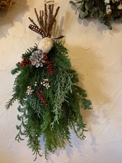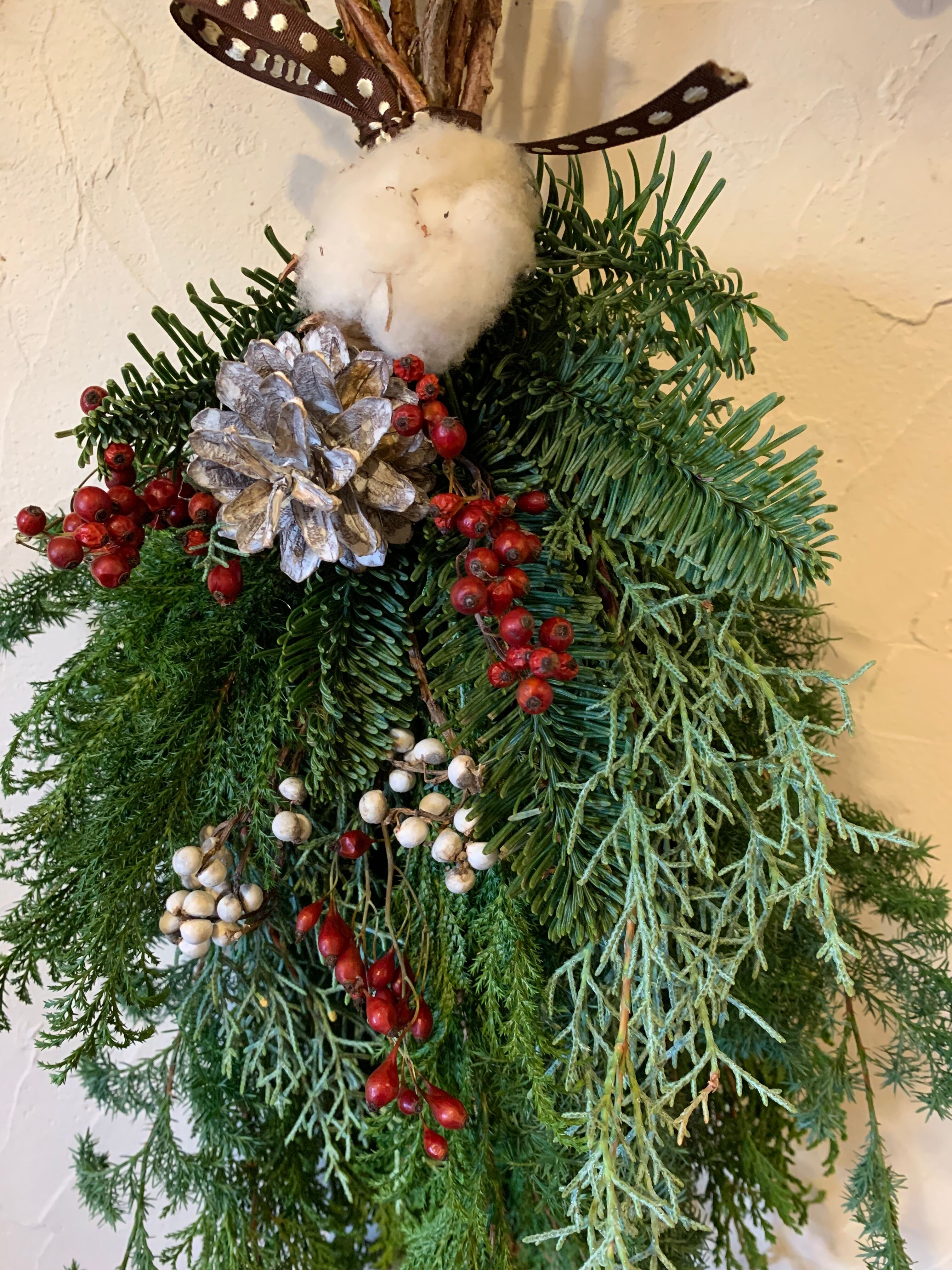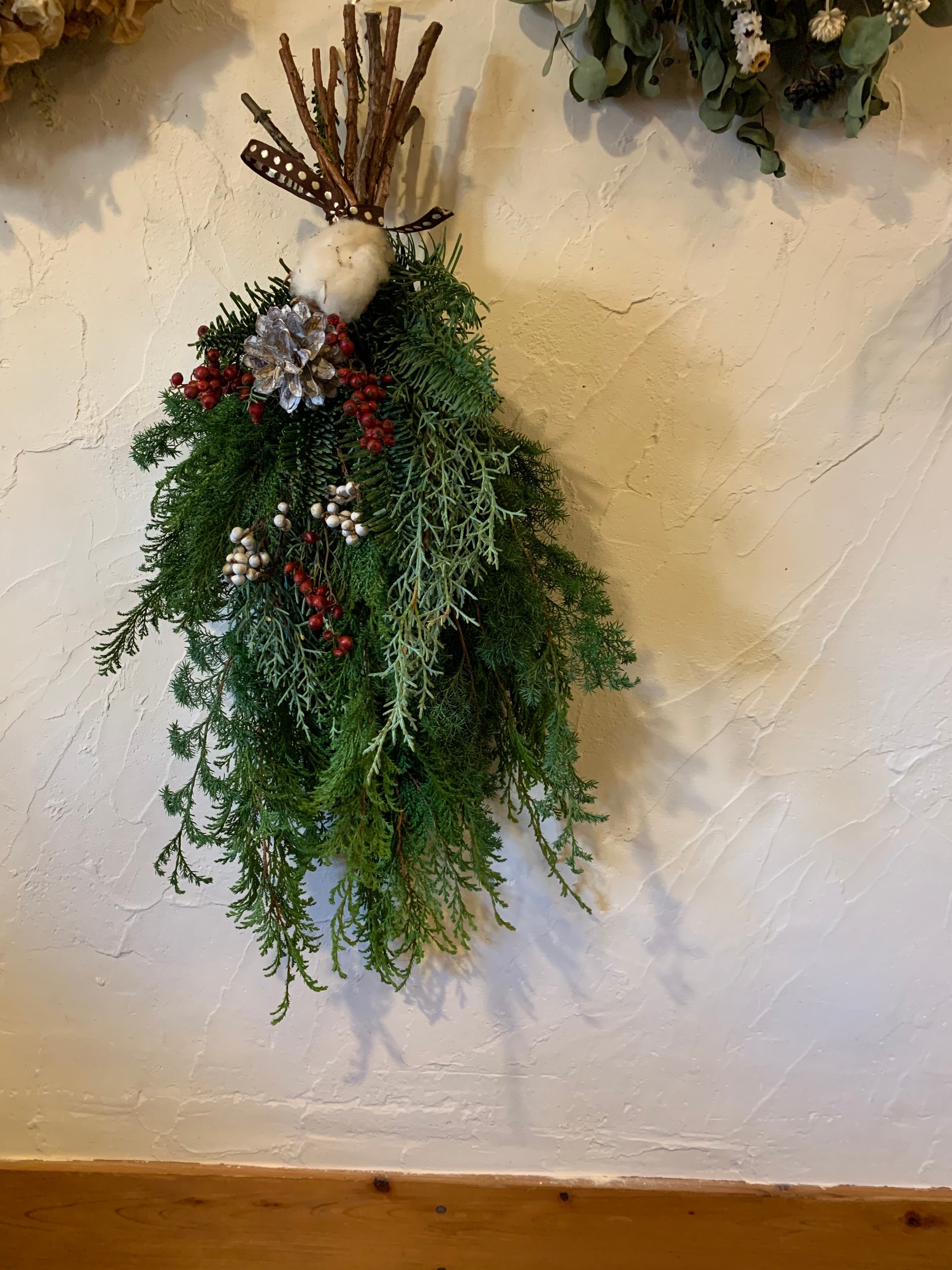 木の香りが癒される針葉樹のスワッグ。