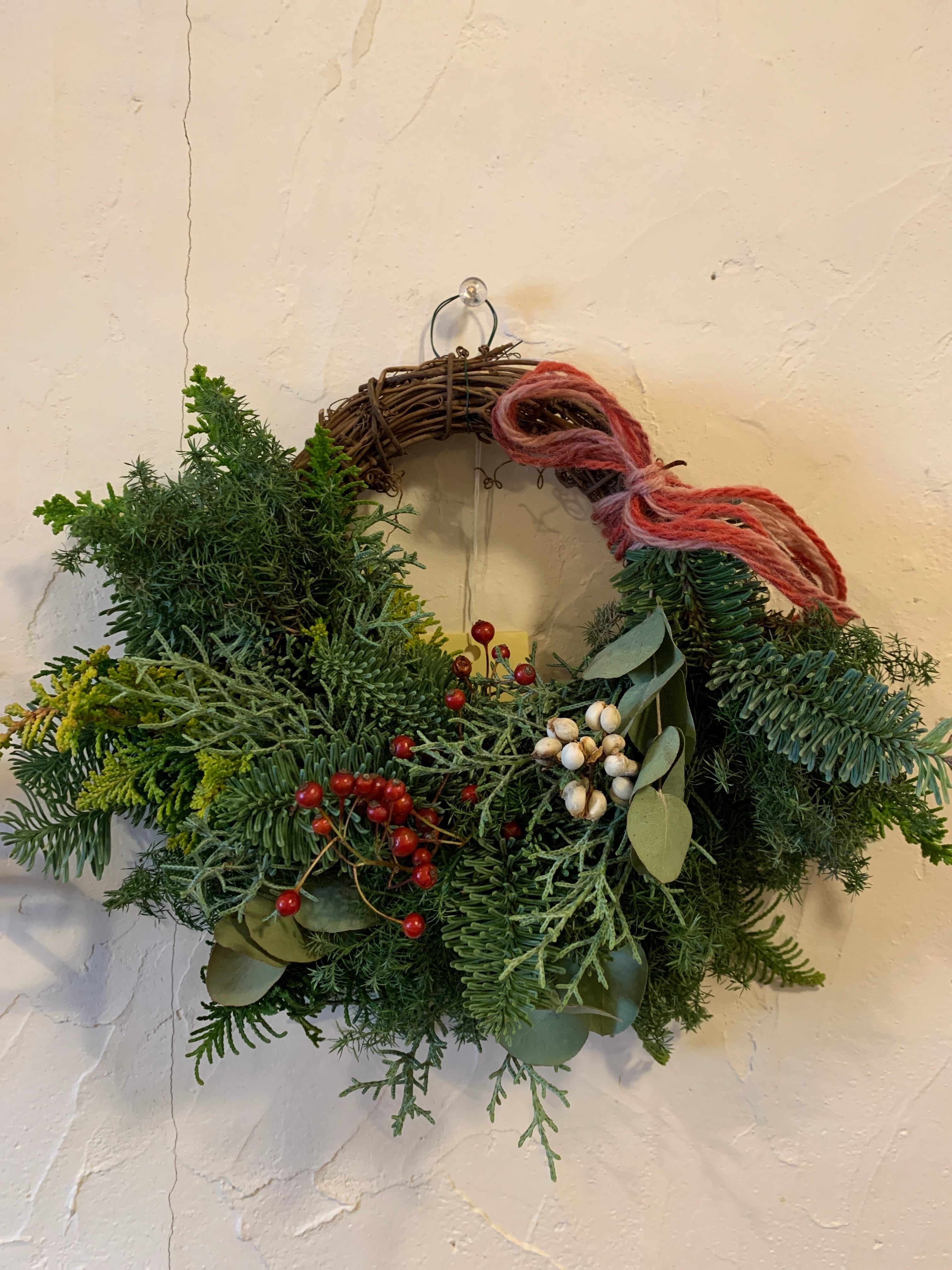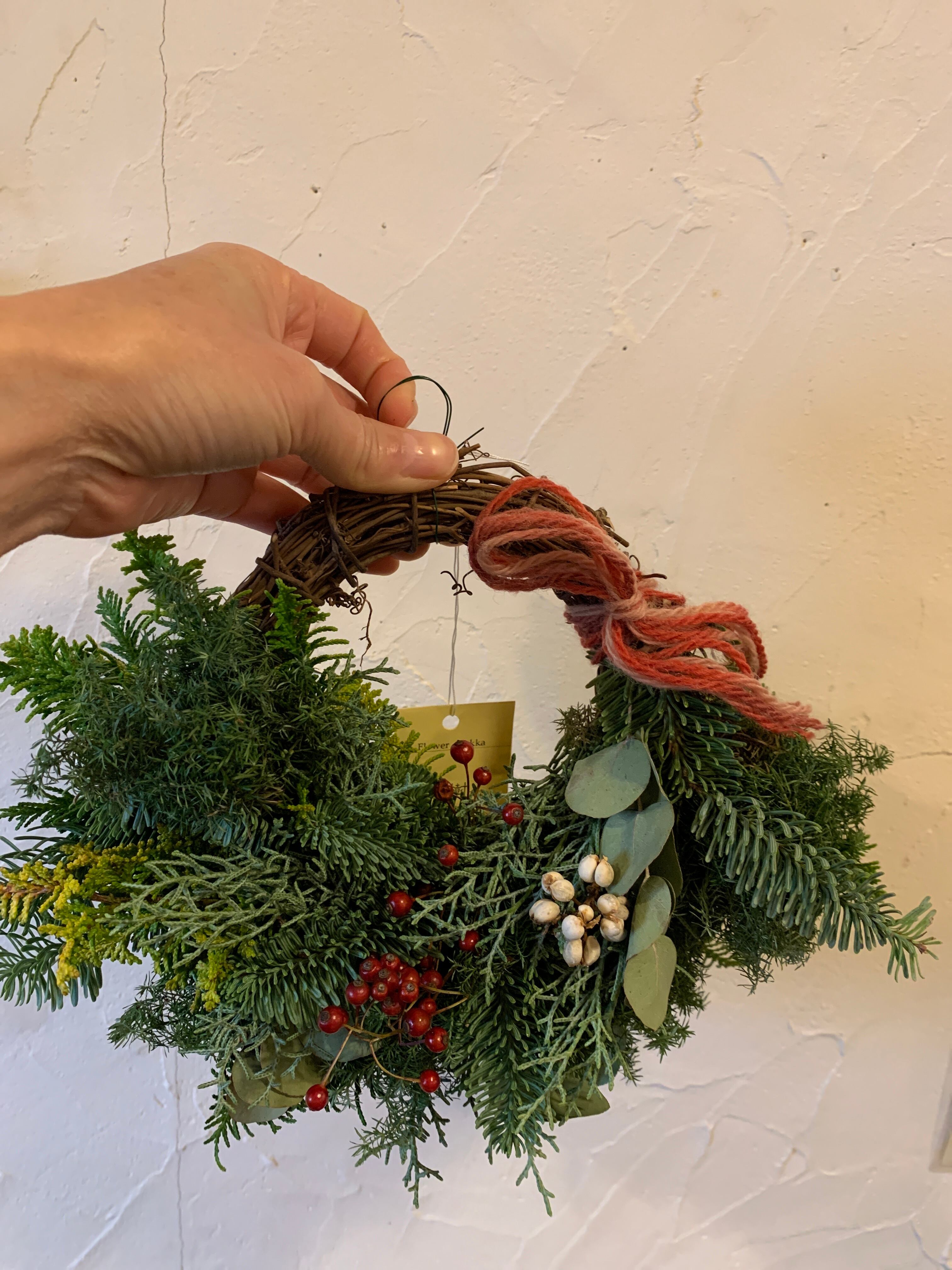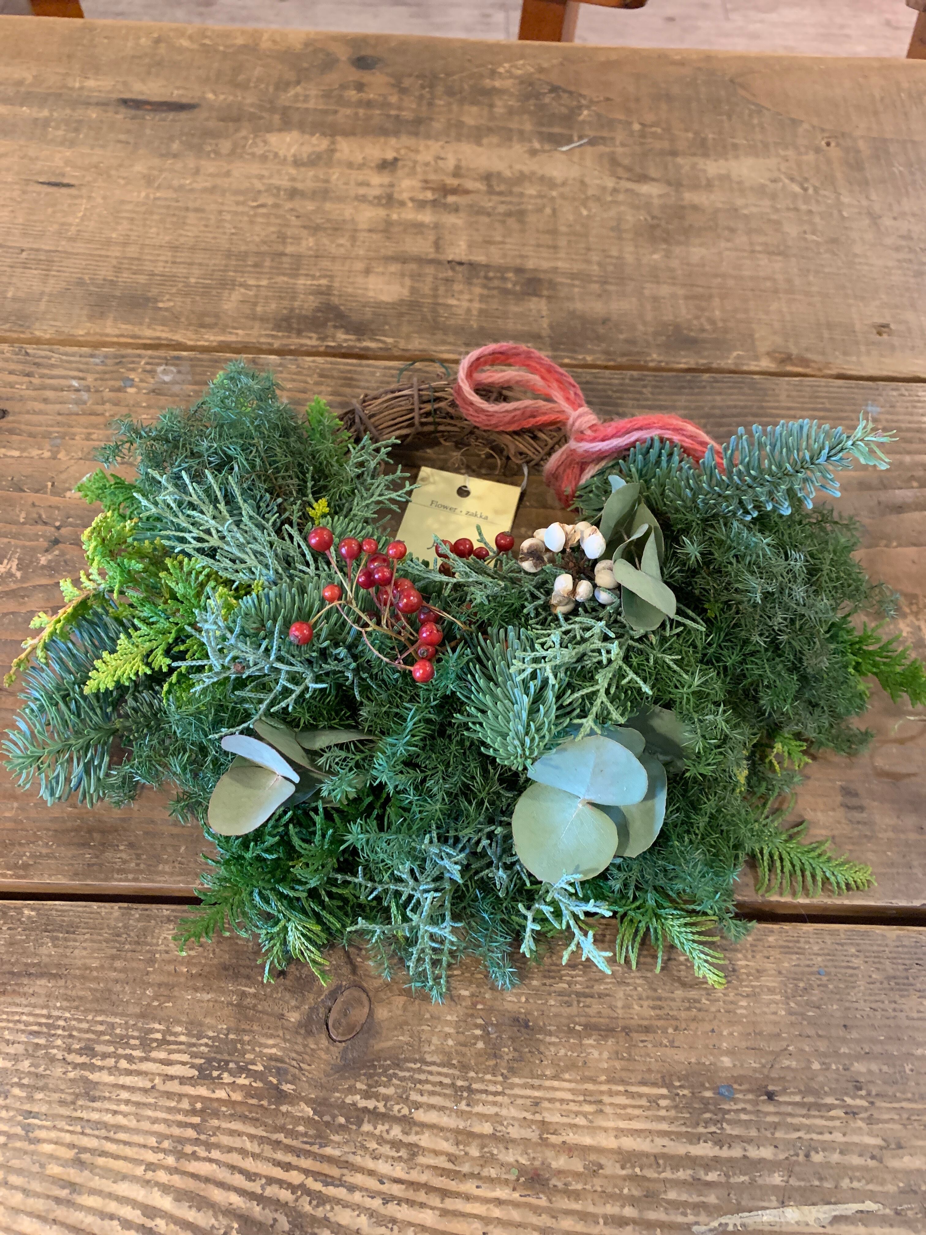 フレッシュの針葉樹5種使用。ドライになっていくさまをお楽しみください。いい香りに癒されます。