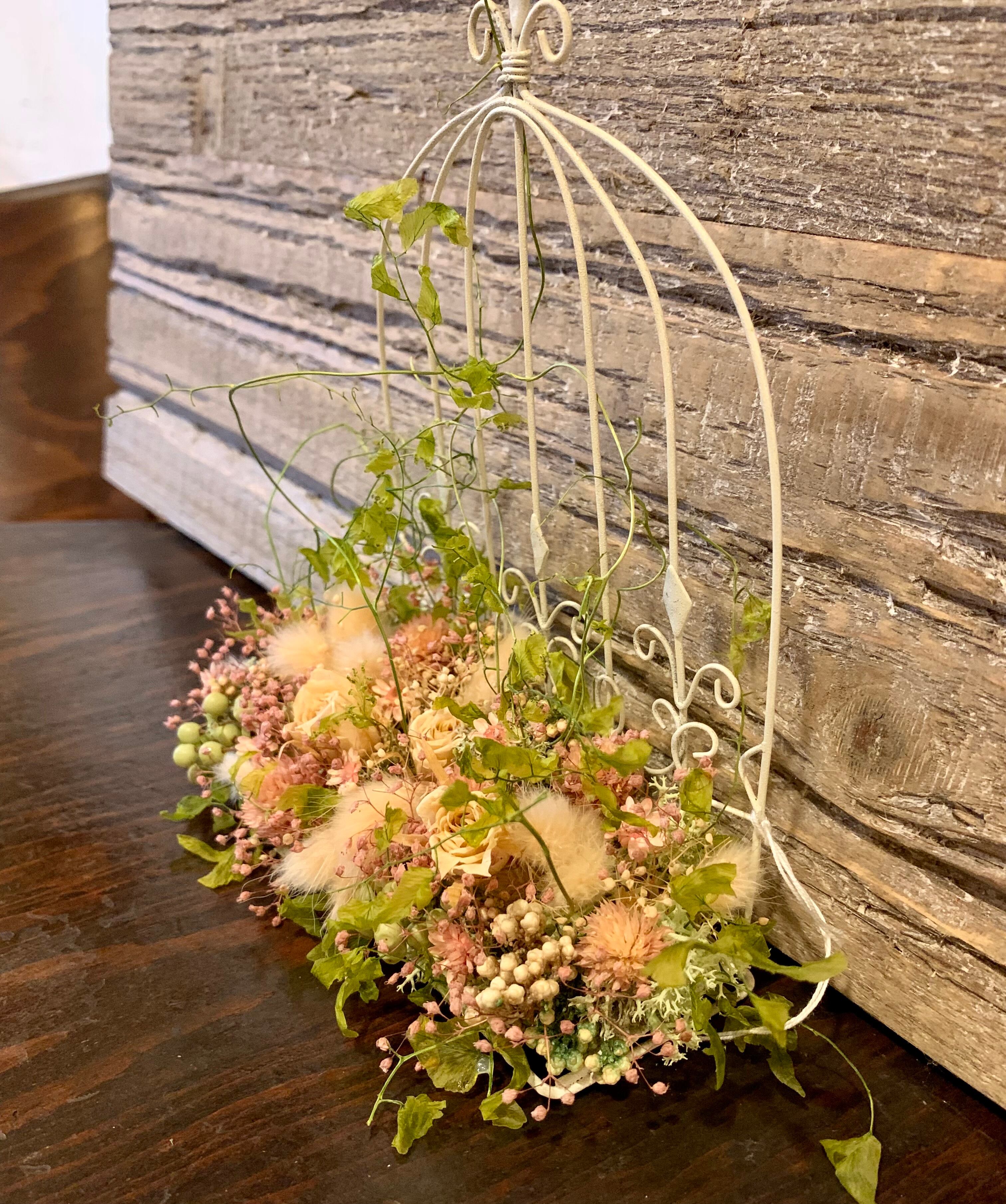 プリザーブドフラワーのミニバラ、小花が入った鳥かご風アレンジ。